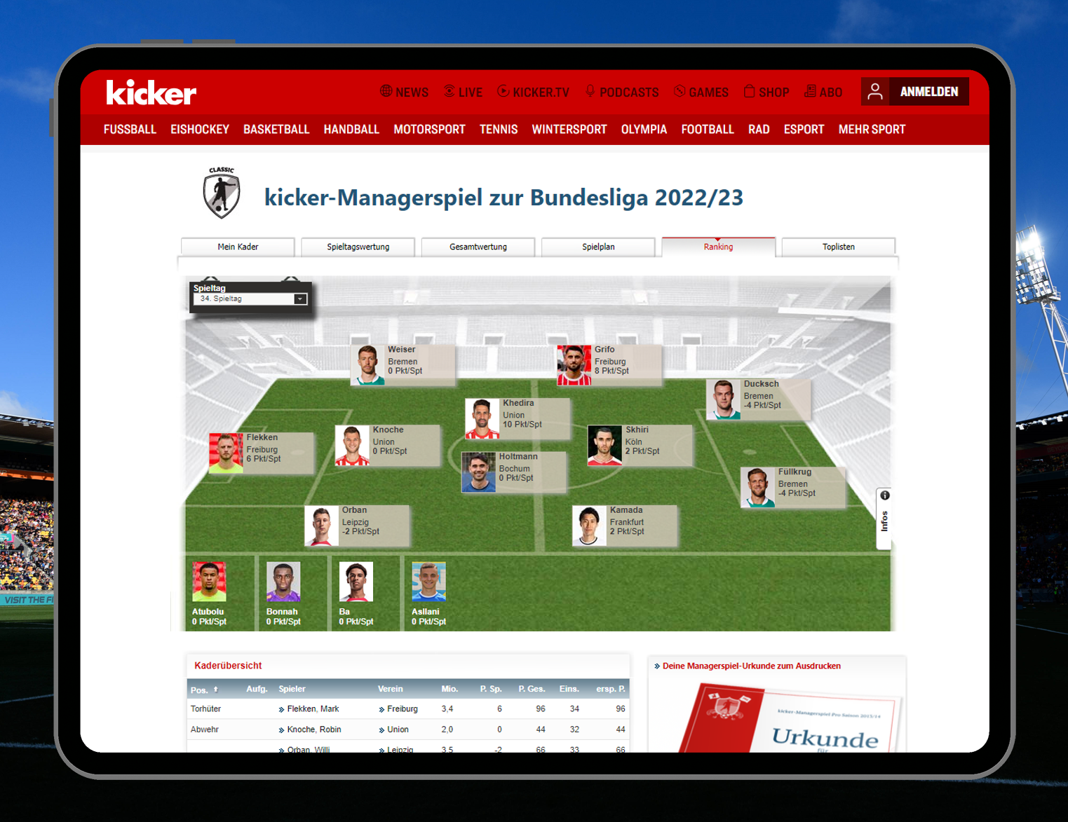 " 2018 gab es zum Saisonstart eine DDOS-Attacke auf den kicker. Man konnte ein paar Stunden vor dem Auftaktspiel nicht mehr auf kicker.de zugreifen und keine Änderungen am Kader mehr durchführen. In dem Spiel hat sich dann auch noch Kingsley Coman schwer verletzt und ist lange ausgefallen. Für einige Manager endet die Saison daher schon recht frühzeitig oder sie konnten erst zum 2. Spieltag einsteigen. Kurz darauf verpflichtete der BVB allerdings Paco Alcacer und alle User, die am 1. Spieltag keinen vollständigen Kader hatten, konnten mit Verpflichtung des Punktelieferanten ein wenig vertröstet werden. Insgesamt aber ein sehr unglücklicher Start in die Saison. Daher raten wir auch jedem User, seinen Kader rechtzeitig fertig zu stellen und keine Schnellschüsse mehr kurz vor dem Start zu machen. Schöner ist da die Anekdote von einem älteren Herrn, der in jedem Sommer in der Redaktion anruft und per Telefon seine Classic-Aufstellung durchgibt. Marktwerte aus dem Sonderheft, Kader zusammengestellt auf Papier, passend auf den Cent. Er hat kein Internet und wir haben ihm eine E-Mail-Adresse und einen kicker-Account erstellt, um sein Team zu speichern. Er freut sich jedes Jahr sehr über die Hilfe und rechnet sein Endergebnis vermutlich selbst aus."
